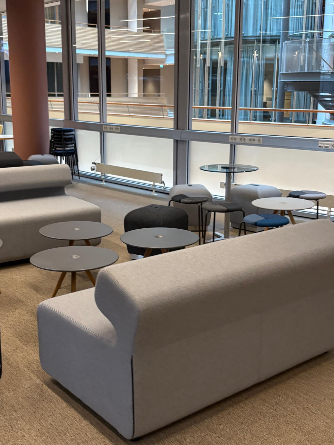 Fellesområder, pulter, printerhjørner, møterom, kjøkken. F.eks rengjøring av søppelkasser, mikrobølgeovn, går over kopper, bestikk, osv